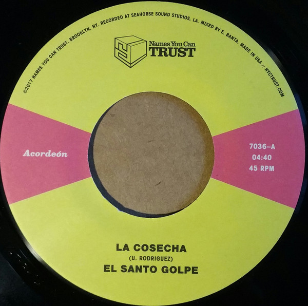 Sold out! El Santo Golpe – La CosechaSold out! NAMES YOU CAN TRUST£11.00 Dancefloor latin from the wonderful Names You Can Trust. Sold out! SKU: 7036 Categories: Africa. Brasil. Latin. Global, Weight not calculated Tag: El Santo Golpe Listen Info Listen La CosechaEl Camotal Additional information Artist El Santo Golpe Catno 7036 Year 2018 Country US Product Type New Vinyl / Reissues Format 7 INCH Media Condition NEW Sleeve Condition NEW