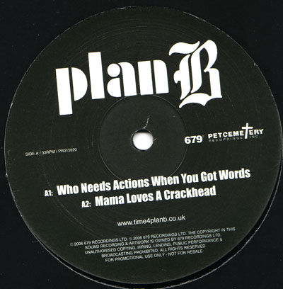 Sold out! Plan B – Who Needs Actions When You Got Words SamplerSold out! PETCEMETERY£5.49 Album sampler from British hip hop/grime sensation. Sold out! SKU: 679 Categories: Hip Hop. Beats, Weight not calculated Tag: Plan B Listen Info Listen Who Needs Actions When You Got WordsMama Loves A CrackheadWhere Ya From? Additional information Artist Plan B Catno 679 Year 2006 Country UK Product Type New Vinyl / Reissues Format 12 INCH Media Condition NEW Sleeve Condition NEW